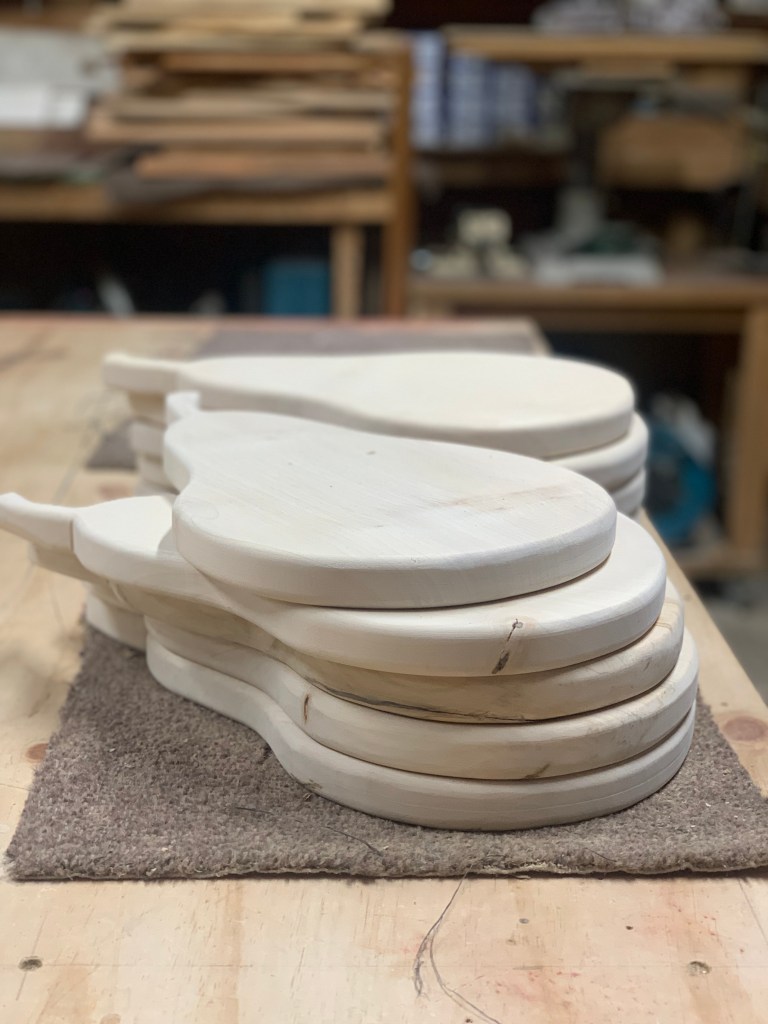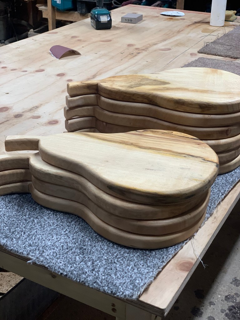 I’ve cut some circles out for bowls. I’ve sanded down some chopping-boards, oiled some chopping-boards, varnished them. Made some benches, putting the nuts and bolts in, sanded them down. Oiled a plant-bed, oiled some of them. I’ve done some painting here. Painted the wood-burner in there, but the paint’s coming off of it now. Picked some tomatoes with Sammy … teaching me what tomatoes to pick and that. The dug-outs, I’ve helped Graham with them, with the nail-gun. I did that with the stapler-gun, put the roofing on that one…