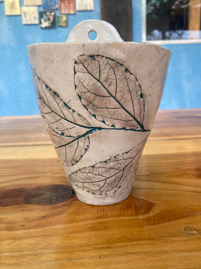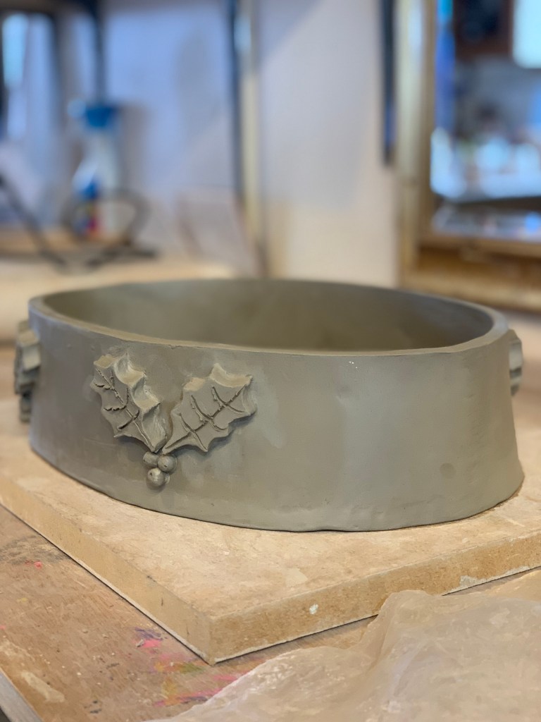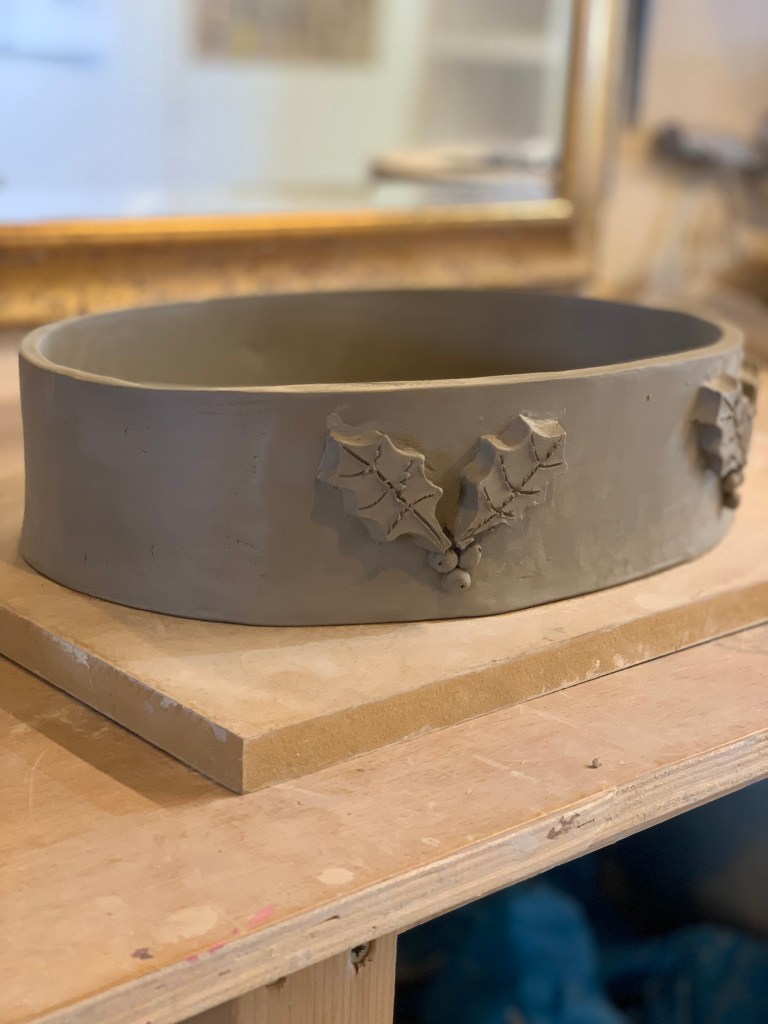 In the pottery we made the Christmas range for our Christmas party … the table dishes. I did the pattern for them and stencils. Yeah, I did Christmas cards and wreath-making. That was fun. I like doing all that. I like doing anything hands-on really. I’m more of a doer than a writer. My writing’s terrible.