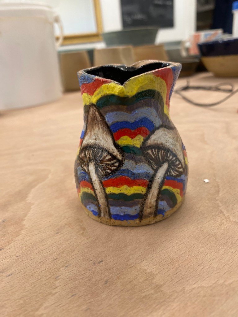 I was really excited today just to come in and see the bits and bobs, see what colour they come out. So yeah, it’s brought out a lot. It’s really like what you call therapeutic. When you’re making stuff you’re not thinking about stuff. So like I broke my toe and on Tuesday, it was like the first morning, and I’d be doing something and then I’d move about … oh my god, my toe … coz I’d totally forgot about it coz I’m just playing, I’m just messing around, whereas I never do that at home … ever.